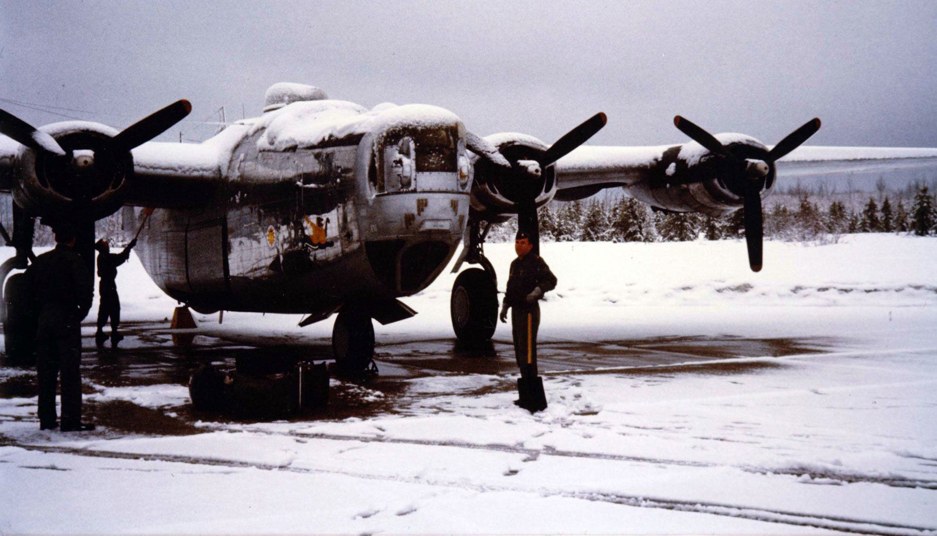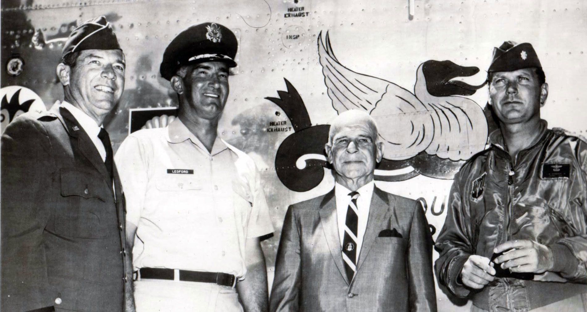 It was during 1969, that the Foundation made its first major acquisition from outside of Tucson. That year the government of the Republic of India retired the last operational Consolidated B-24 Liberators in the world. One of the Foundation’s leaders, Lt. Colonel Rhodes Arnold wrote to the Chief of the Indian Air Staff in New Delhi, asking that one of the rare bombers be donated to the museum. Much to everyone’s surprise the Indian government agreed, as long as the Foundation paid all the costs of delivery. On March 22, 1969 after several months of gathering sponsors and fund raising, a volunteer U.S. Air Force crew arrived in India to pick up the Liberator. After stops in the Middle East, Europe, Canada, and back at the factory in Fort Worth, Texas where it had been built, the B-24 arrived in Tucson on April 27, 1969, thirty-one days and 11,000 miles after leaving India. Dignitaries from the U.S. Air Force, the Indian government and Pima County, led by aviation pioneer General Jimmy Doolittle were on hand to greet the plane and congratulate the crew on their achievement.