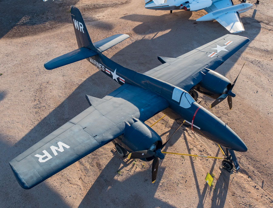 The Grumman Tigercat was the first twin-engine fighter to go into production for the U.S. Navy. Although it was intended to operate from aircraft carriers it rarely did so as the aircraft’s weight and speed made it overly dangerous. Operated from land bases the Tigercat proved to be a very good performer. It was fast, heavily armed, very maneuverable for a two-engine fighter, and easy to fly. Although the F7F first flew in 1943 it was not until August 13, 1945 that the first Tigercat fighter squadron reached Okinawa. Several Tigercat variants were produced including the single seat day fighter, a two-seat night fighter, and a single seat photo reconnaissance version. Having missed World War II by a matter of hours the F7F had to wait for the Korean War to prove its abilities. Tigercats operated successfully as night fighters, and in night ground interdiction missions. The F7F was phased out of Marine service by 1954 but several Tigercats were sold to civilians for aerial firefighting. Of the 364 Tigercats built fewer than 10 remain.