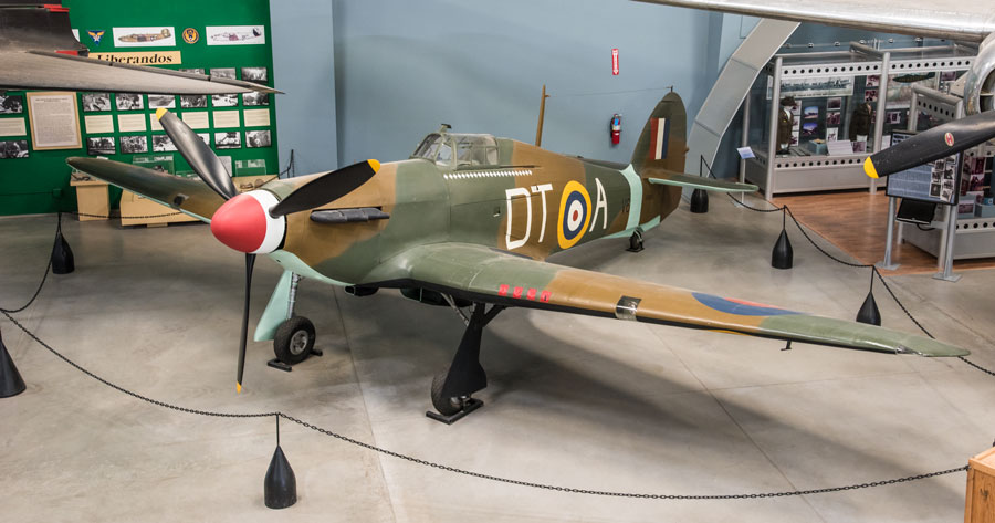 The Hawker Hurricane was the first modern monoplane fighter flown by the Royal Air Force. Design work began as early as 1932, but the prototype did not take to the air until November 1935. In addition to being the first British fighter to have both a single wing and retractable landing gear the Hurricane also introduced much heavier firepower with a total of eight machine guns mounted in its wings. After initial testing the RAF placed a huge order for 600 Hurricanes. It was this model, the Hurricane Mk. I, that bore the brunt of the Battle of Britain during the summer of 1940. Late in 1940 the Hurricane Mk. II appeared in RAF service. This version of the fighter was slightly larger and had a more powerful version of the Merlin engine. The Mk. II became the most produced version of the Hurricane with 8,000 built in England and Canada.