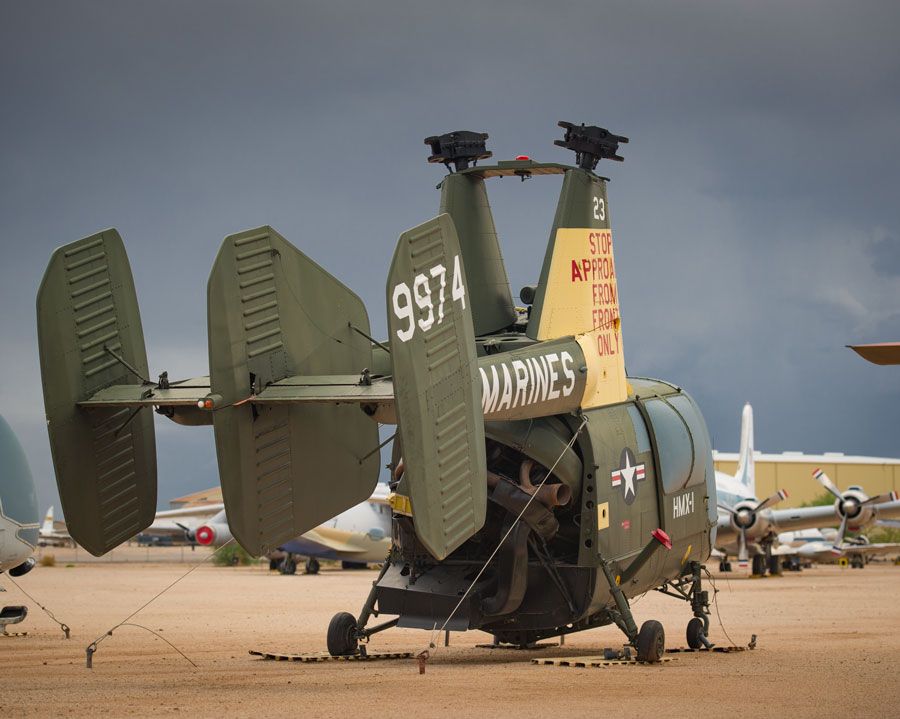 Kaman began development of the Huskie in 1950 for the Navy and Marine Corps.  The prototype first flew in 1953.  The helicopter’s twin intermeshed rotor configuration eliminates the need for a tail rotor, but the angle at which they must be mounted forces the rotor blades to approach very near the ground when the aircraft is landed making it difficult to get close to the aircraft while the rotors are turning.  The early Huskies used by the Navy and Marine Corps used a radial aircraft engine, while the later Air Force version used a turbine engine.